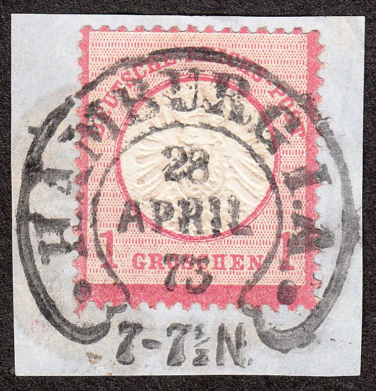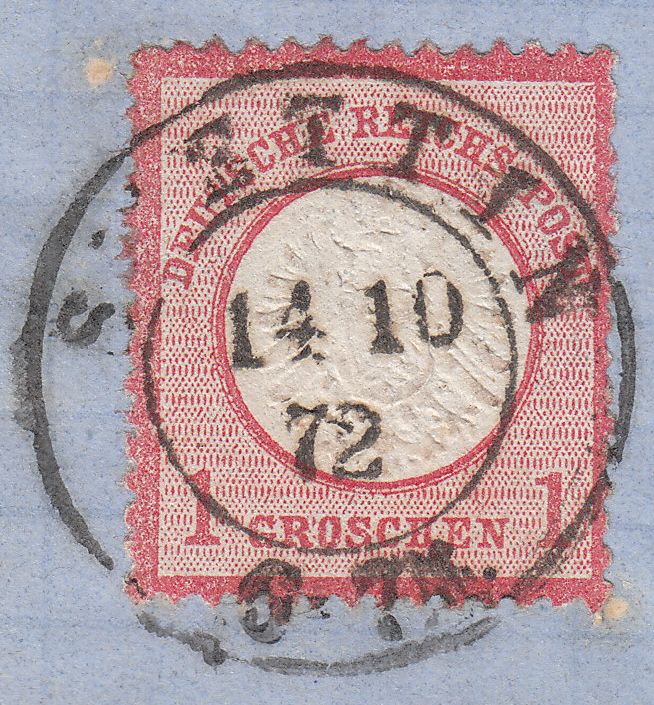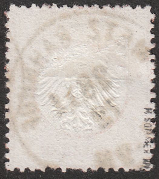 Die Entwertung erfolgte am 14.03.1873 mit einem nachverwendeten Preussenstempel ROESSEL: