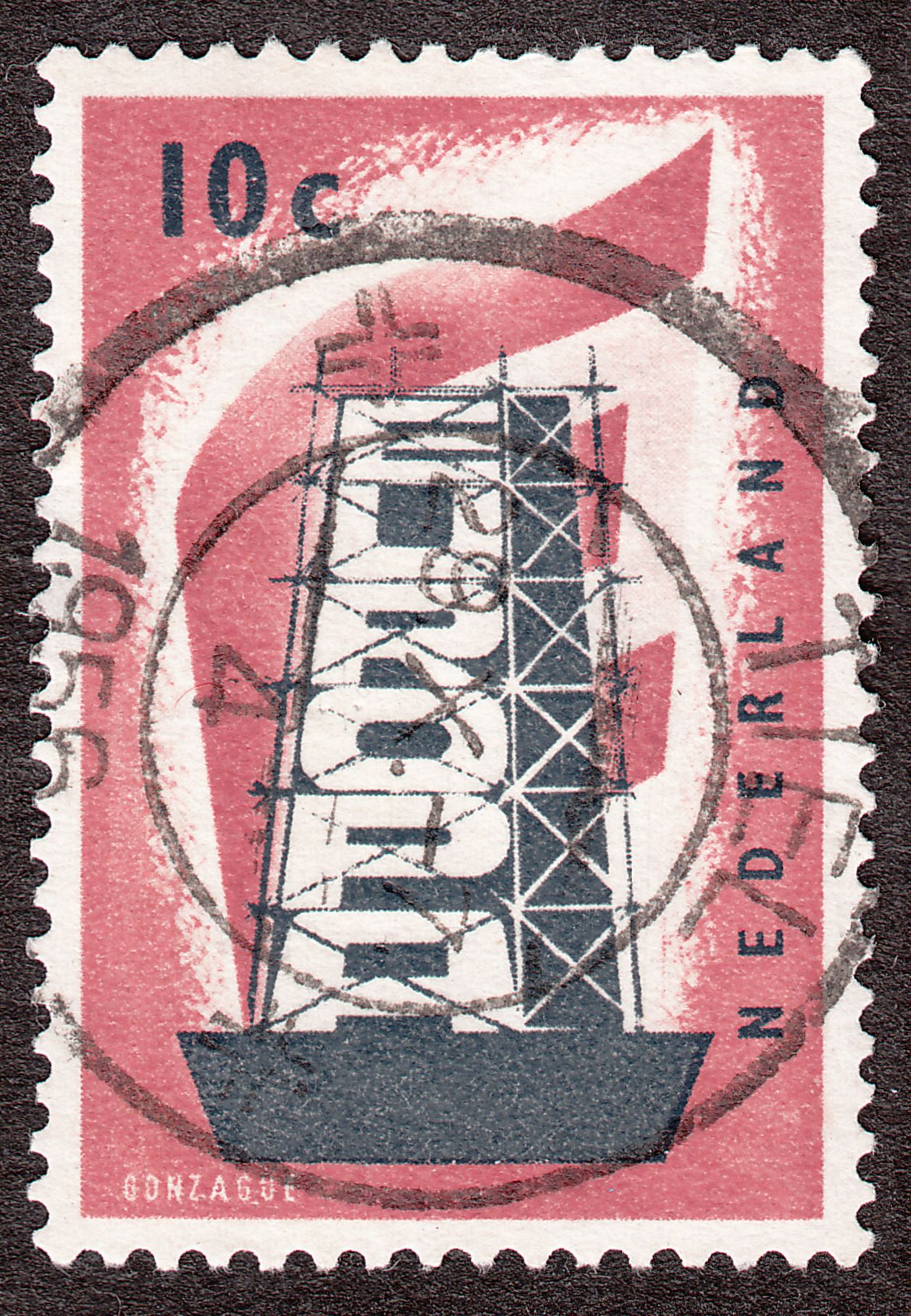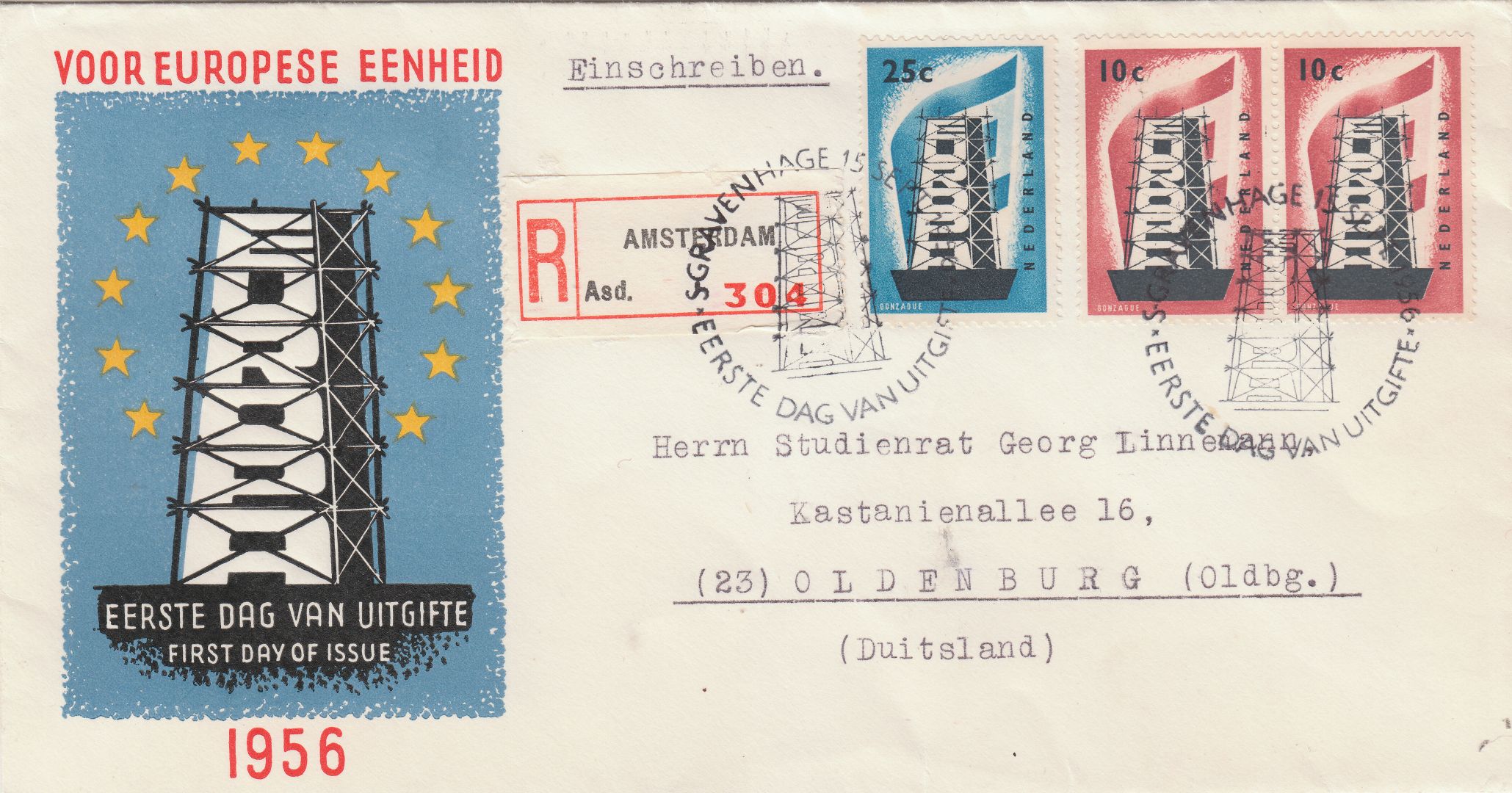 Am 15.09.1956 erschien in den Niederlanden in einer Auflage von 44.517.700 Stück die Europamarke 1956 der Wertstufe 10 Cents, Niederlande MiNr. 681, hier als Paar in Mischfrankatur mit einem Exemplar der Wertstufe 25 Cents auf FDC per Einschreiben nach Deutschland gelaufen: