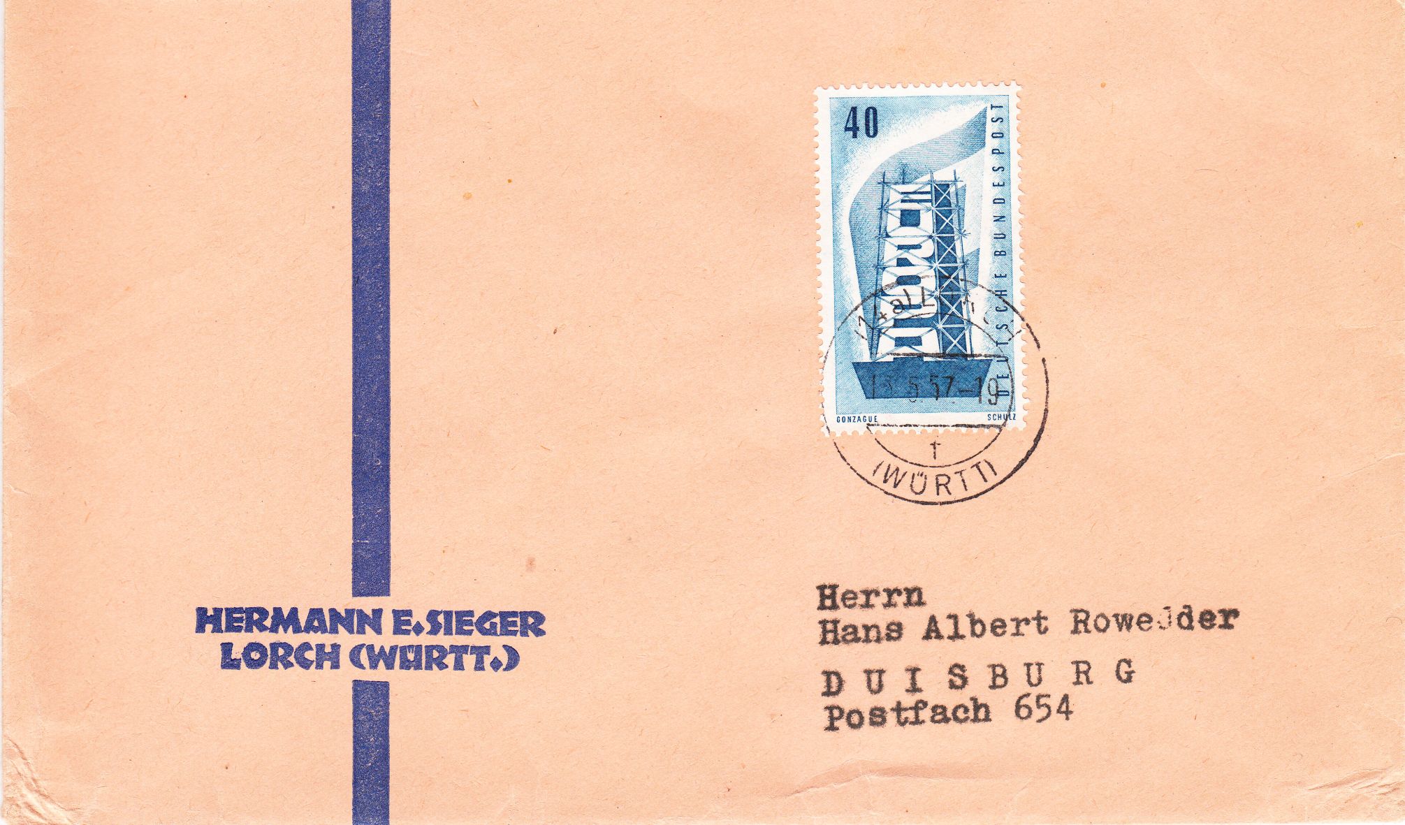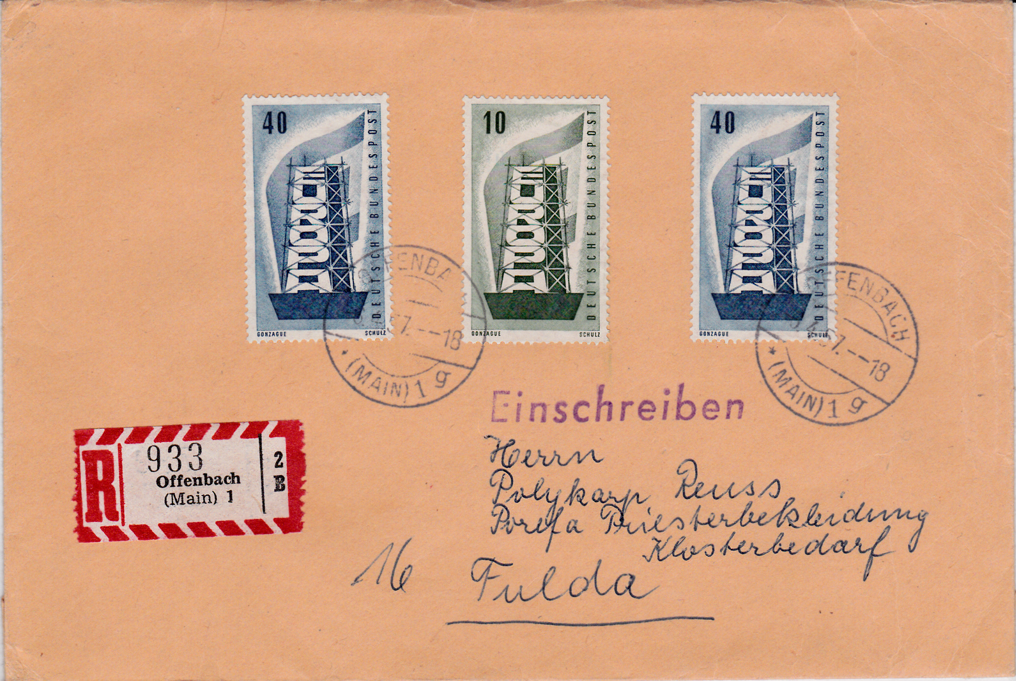 Dieser Brief der zweiten Gewichtsstufe (über 20g) per Einschreiben wurde mit zwei Europamarken 1956 zu 40Pf und einer Europamarke zu 10Pf portogerecht frankiert. Das Porto für einen Brief über 20g (bis zu 250g) betrug 1957 40Pf, für die Zusatzleistung Einschreiben kamen 50Pf hinzu, zusammen also 90Pf. Der Brief wurde am 6.4.1957 von Offenbach nach Fulda verschickt.