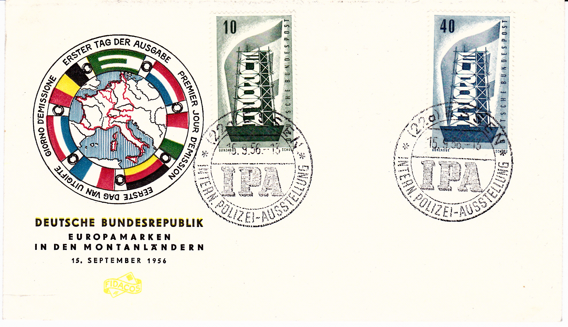 Schmuck-FDC mit den beiden Europamarken 156 der Deutschen Bundespost gestempelt mit dem Sonderstempel vom 15.9.1956 zur Internationalen Polizeiausstellung in Essen.
