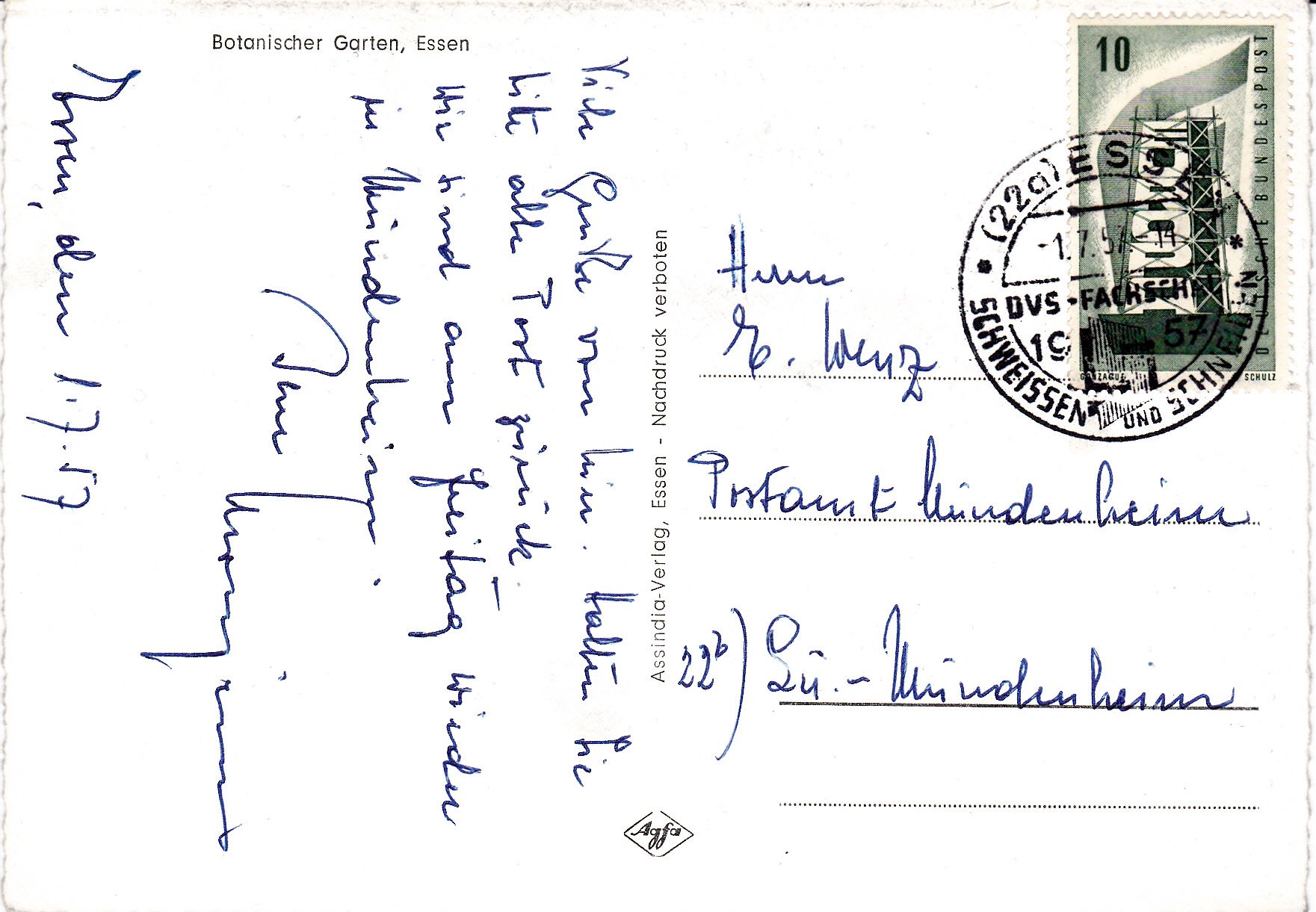 Portogerechte Einzelfrankatur auf Postkarte mit Sonderstempel aus Essen.