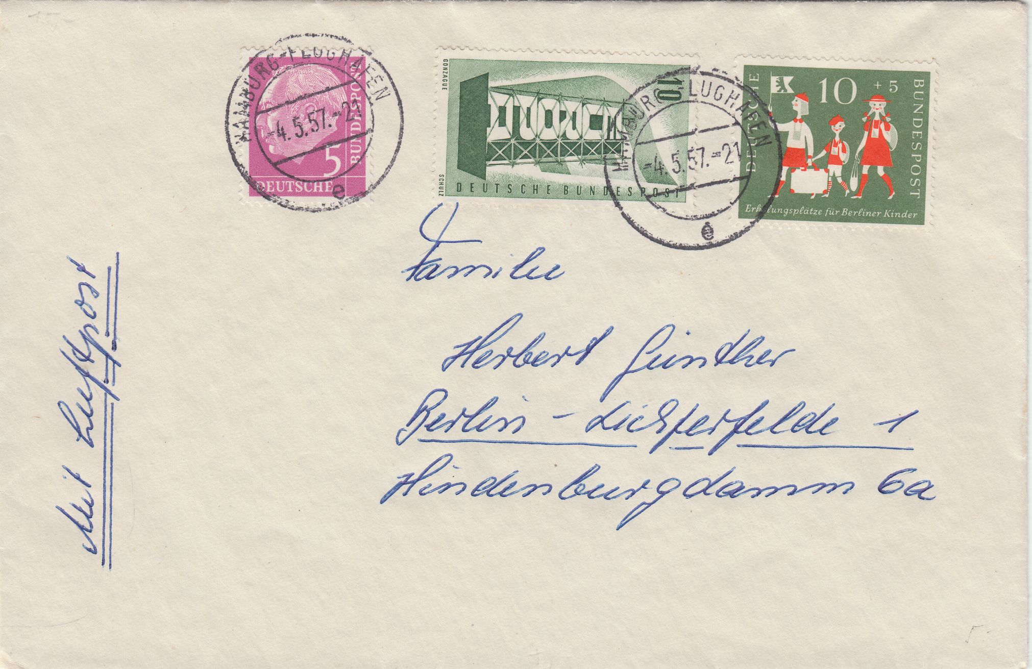MiF am 04.05.1957 als Portostufe 25 Pfennig für einen Fernbrief (20 Pfennig) per Luftpost (5 Pfennig) von Hamburg nach Berlin:
