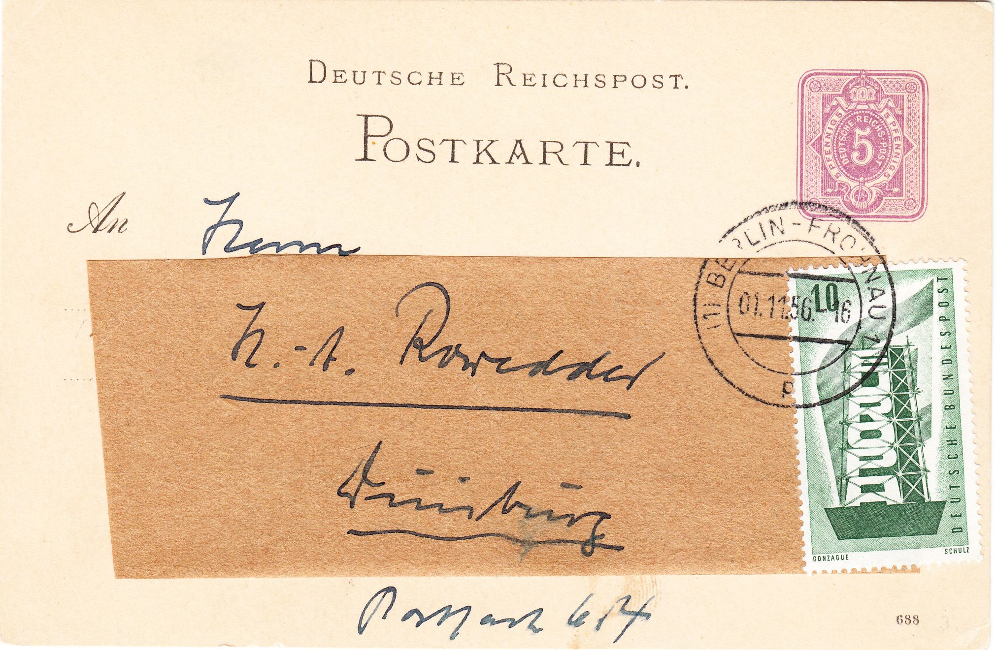 Portogerechte Einzelfrankatur auf Postkarte im Fernverkehr am 01.11.1956, wobei in diesem Falle eine Postkarte der Deutschen Reichspost aus dem Jahre 1888 als Formular verwendet wurde: