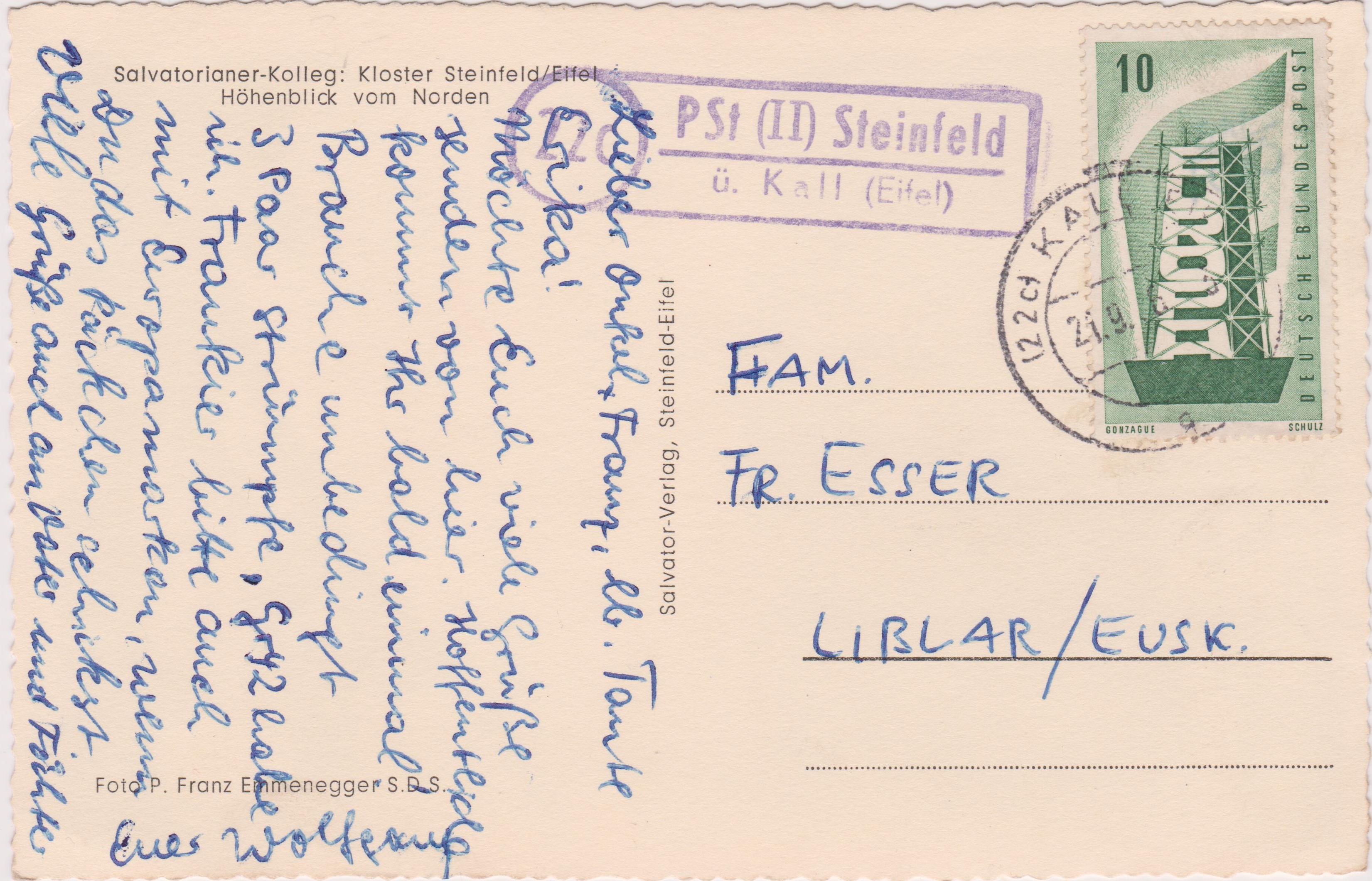 Portogerechte Einzelfrankatur auf Postkarte im Fernverkehr, aufgegeben bei der Poststelle II "PSt (II) Steinfeld":