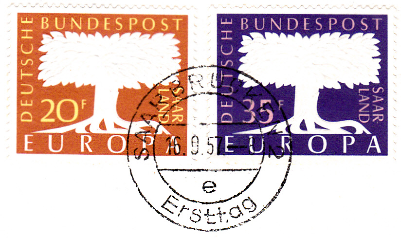 Im Saarland erschienen am 16.9.1957 ebenfalls Europamarken 1957 mit dem Motiv "stilisierter Baum mit sechs Wurzeln" entsprechend den sechs Ländern der Montanunion. Hier der Wert zu 20 Fr dunkelorange/ mittelorangegelb, der in einer Auflage von 1 832 220 Stück erschien.