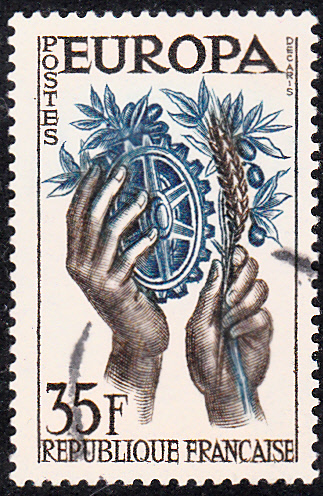 Die Europamarken 1957 erschienen in Frankreich am 16. September 1957 mit dem Motiv "Zwei Hände mit Zahnrad, Olivenzweigen und Ähre". Hier die Marke zu 35 Francs braun/grünlichblau, die in einer Auflage von 9 335 000 Stück erschien.