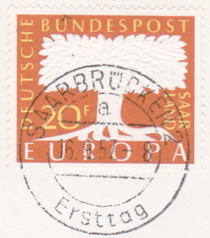 Im Saarland erschienen am 16.9.1957 ebenfalls Europamarken 1957 mit dem Motiv "stilisierter Baum mit sechs Wurzeln" entsprechend den sechs Ländern der Montanunion. Hier der Wert zu 20 Fr dunkelorange/ mittelorangegelb, der in einer Auflage von 1 832 220 Stück erschien.