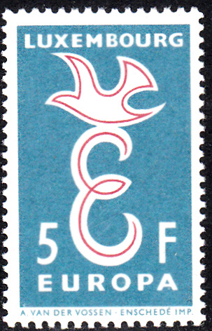 In Luxemburg erschienen die Europamarken 1958 am 13. September 1958. Hier die Marke zu 5 Fr türkisblau/dunkelrosakarmin mit dem Gemeinschaftsmotiv "Stilisierte Taube über Buchstabe „E“" , die in einer Auflage von 777 500 Stück erschienen ist.
