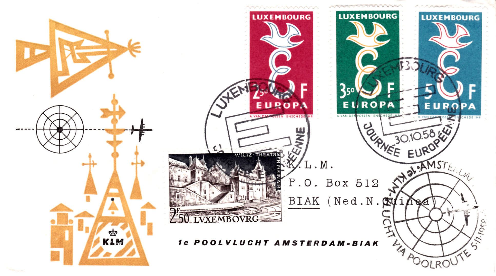 Alle drei Europamarken 1958 aus Luxemburg und eine weitere Marke wurden auf diesem Brief mit dem 1. Flug der KLM am 5.11.1958 zur Insel Biak (Niederländisch Neuguinea).