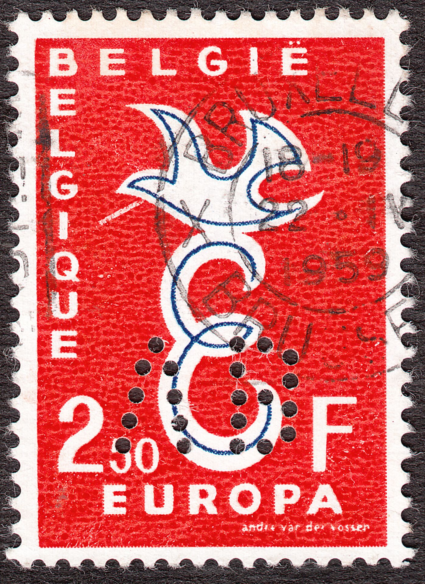 Diese am 22.04.1959 in Brüssel = BRUXELLES gestempelte Europamarke der Wertstufe zu 2,50 Francs hat eine Firmenlochung = Perfin "VB" der Firma "Vanbreuze & Co":