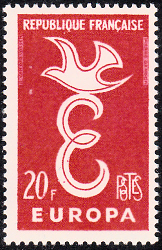Im Frankreich erschienen am 13.9.1958 die Europamarken 1958 mit dem Gemeinschaftsmotiv "Stilisierte Taube über Buchstabe „E“". Hier der Wert zu 20 Fr rot, der in einer Auflage von 19 805 000 Stück erschien.