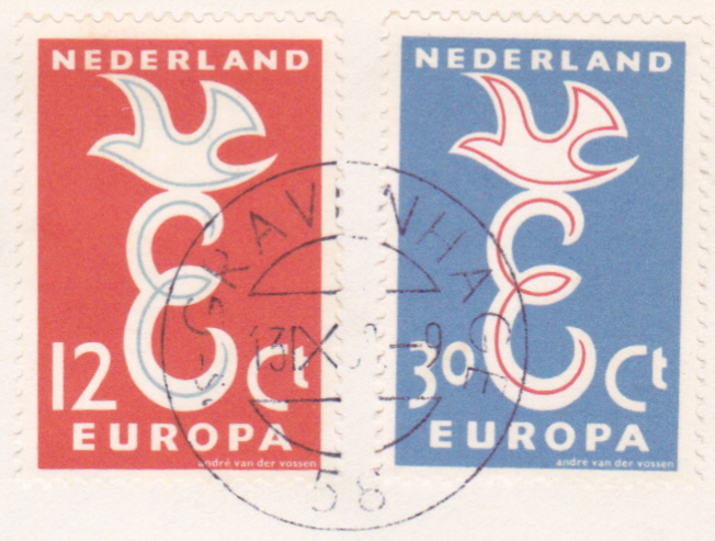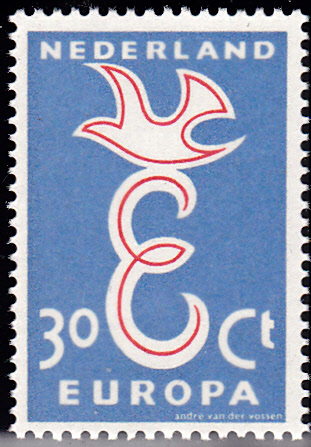 In den Niederlande erschienen am 13.9.1958 die Europamarken 1958 mit dem Gemeinschaftsmotiv "Stilisierte Taube über Buchstabe „E“". Hier der Wert zu 30 Cent hellblau/karminrot, der in einer Auflage von 4 494 350 Stück erschien.