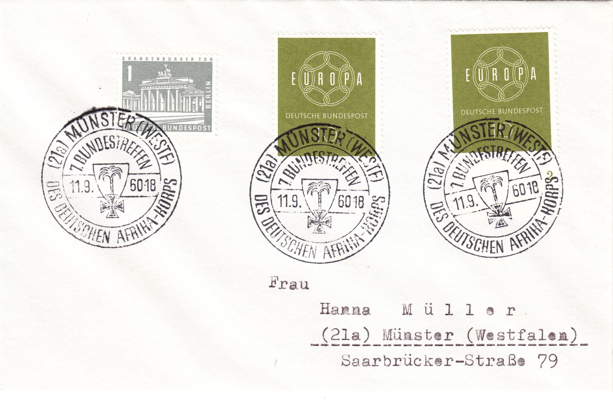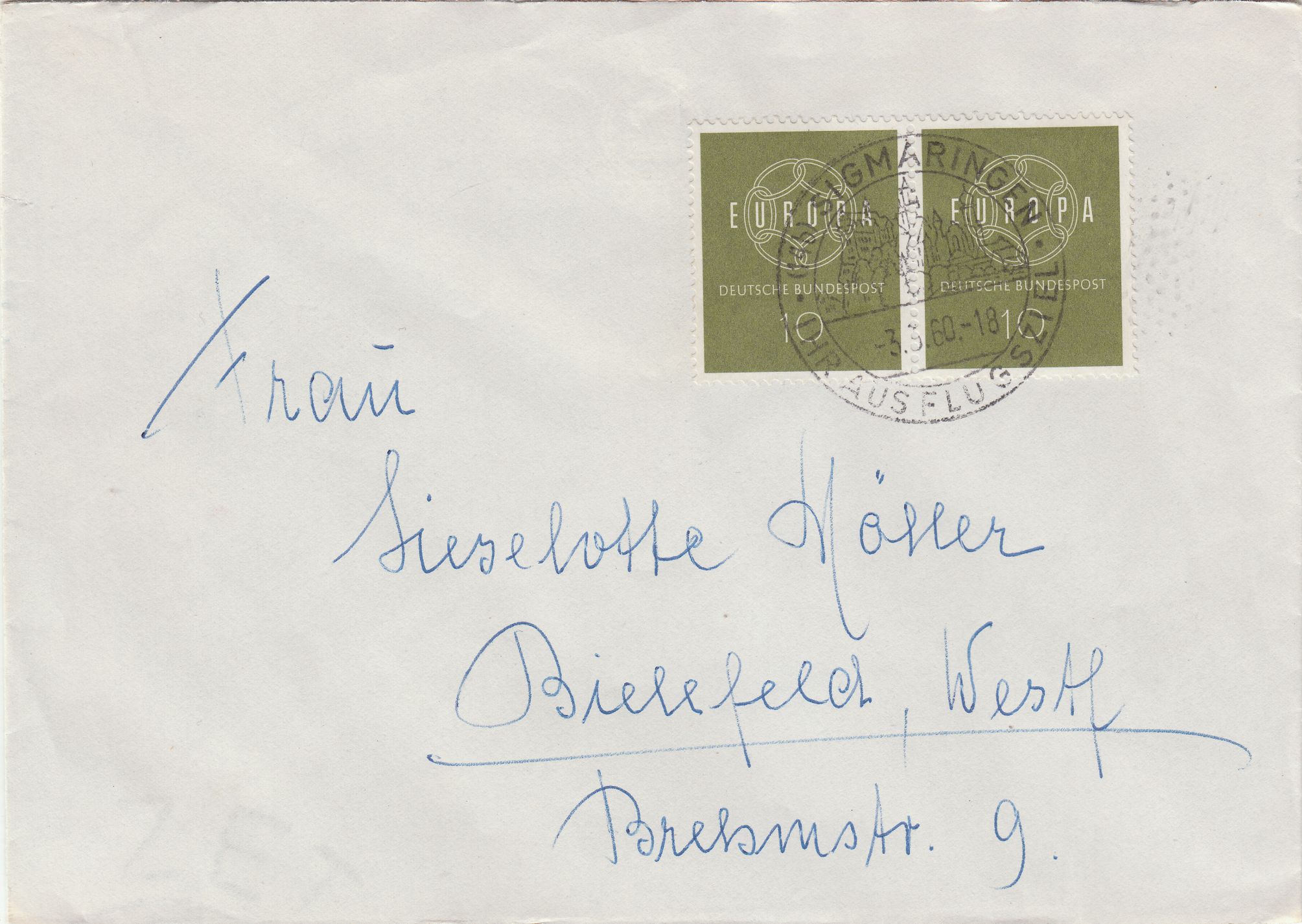 Ein Brief im Ortsverkehr mit einem Gewicht von über 20 Gramm kostete 20 Pfennig Porto. Dieser Brief wurde am 11.09.1960 zur Abdeckung des Portos mit zwei Exemplaren der Europamarke 1959 in der Wertstufe zu 10 Pfennig frankiert: