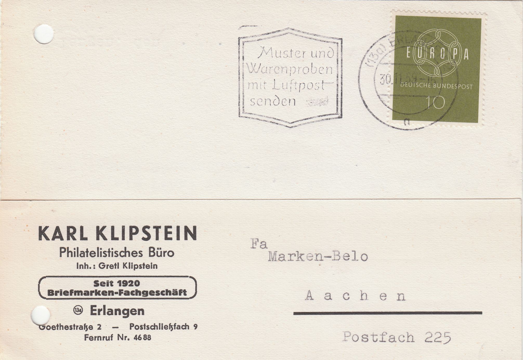 Interessant finde ich hier den Werbeeinsatz "Muster und Warenproben mit Luftpost senden". Dieser Maschinen-Serienstempel ist katalogisiert als Bochmann Nr. S 943 und war von 1959 bis 1961 in 10 Orten im Einsatz, bei diesem Beispiel in ERLANGEN 2.