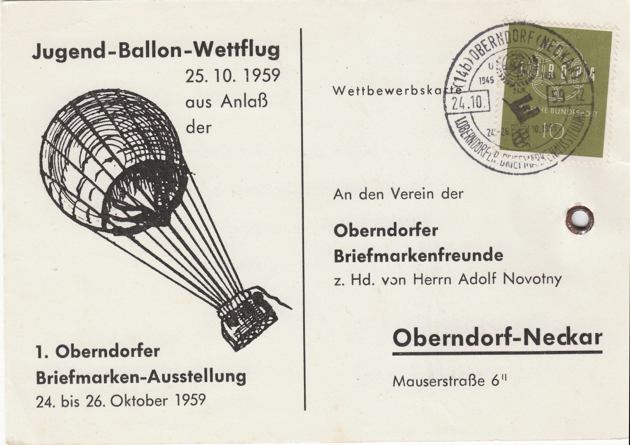 Mit diesem Beleg wurde eine der "Wettbewerbskarten" philatelistisch dokumentiert, die bei einem "Jugend-Ballon-Wettflug" zum Einsatz kamen. Diese Postkarte wurde am Tag vor diesem Ereignis per Handwerbestempel entwertet.