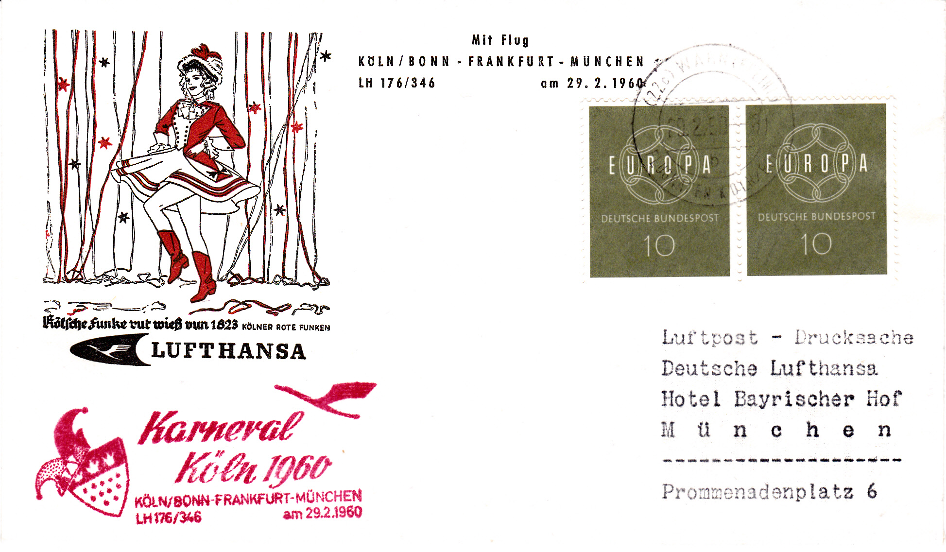Diese Drucksache mit Luftpost ist mit zwei Marken zu 10Pf der Europamarke 1959 frankiert und wurde von der Deutschen Lufthansa für Werbezwecke aus Anlass des Erstfluges am 29.2.1960 von Köln/Bonn nach München hergestellt. Der Brief ist nicht portogerecht. Die Drucksache kostete bis 20g 7Pf, von 21 bis 50g 10Pf und der Luftpostzuschlag je 50g 5Pf. Das ergibt bis 20g insgesamt 12Pf und bis 50g 15Pf.