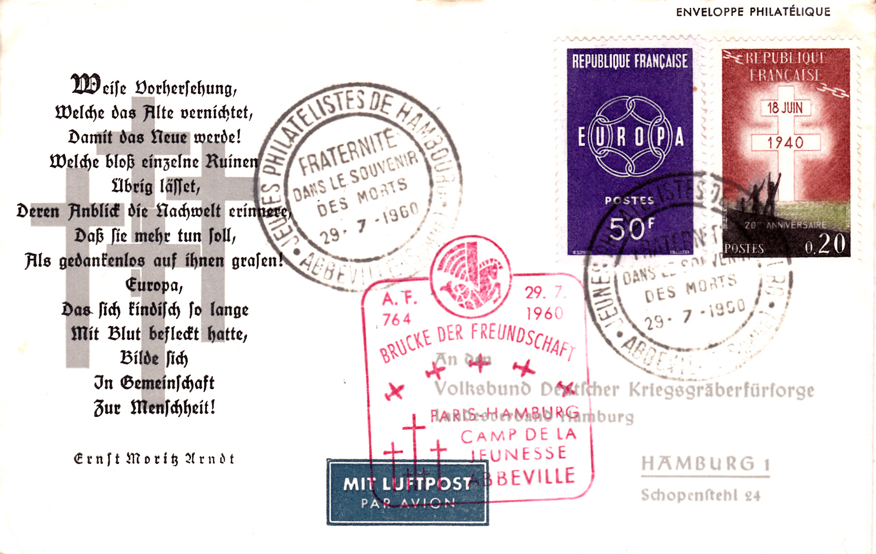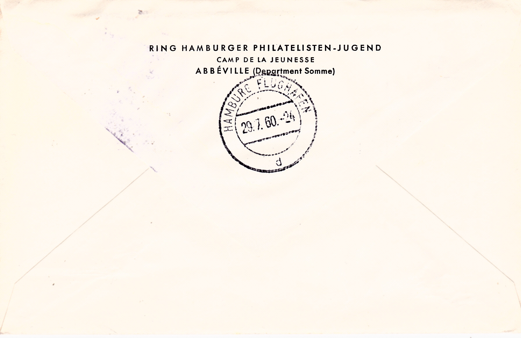 Auf diesem Brief wurde die Europamarke 1959 zu 50 Francs zur Frankatur verwendet. Sie wurde mit einem Sonderstempel aus Abbeville zum Camp des LR Hamburg der Deutschen Philatelisten Jugend am 29.7.1960 abgestempelt und mit Luftpost von Paris nach Hamburg befördert worden. Rückseitig findet man einen Ankunftsstempel Hamburg Flughafen ebenfalls vom 29.7.1960 24 Uhr.