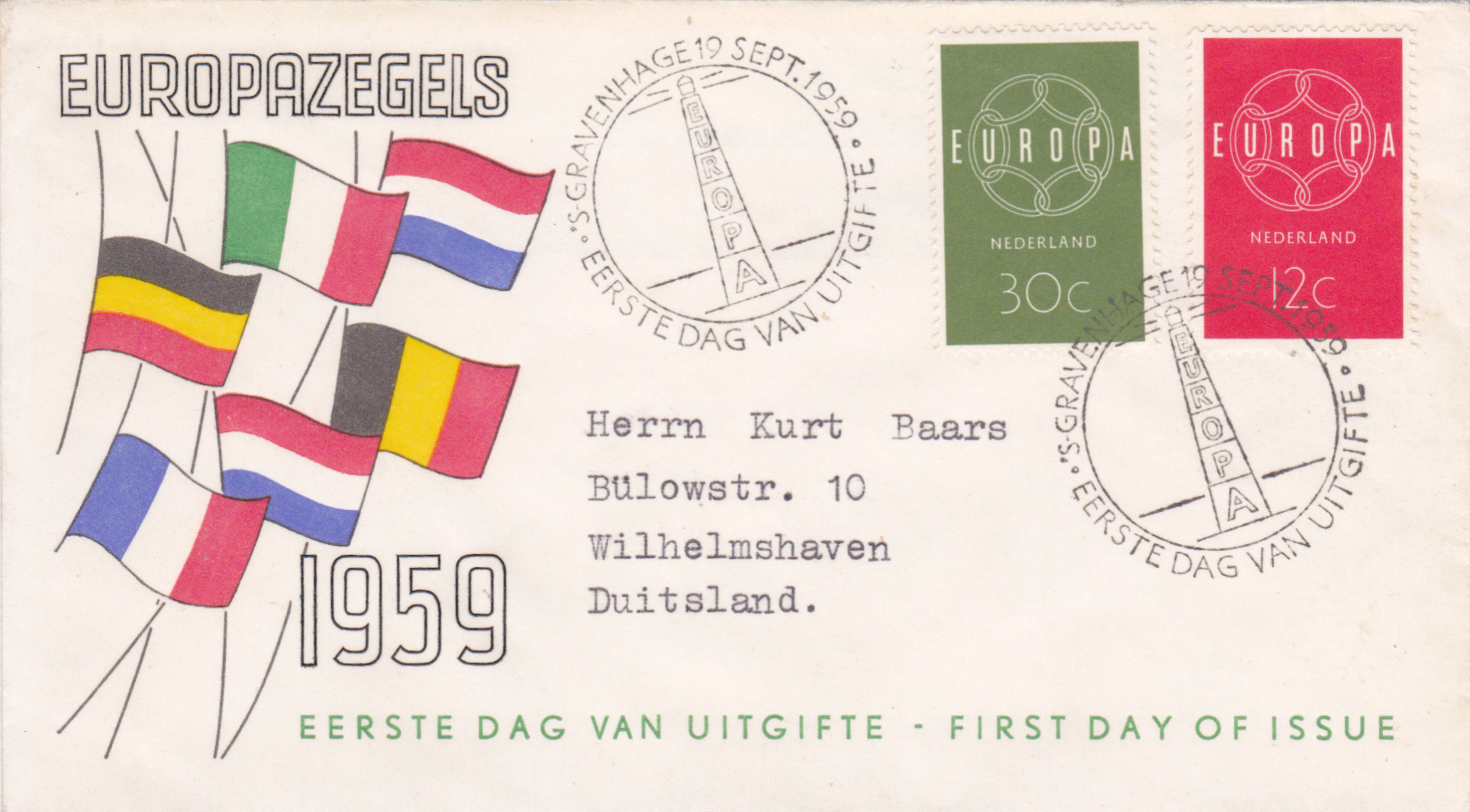Ersttagsbrief mit den beiden Europamarken 1959 aus den Niederlande und einem Ersttagsonderstempel.