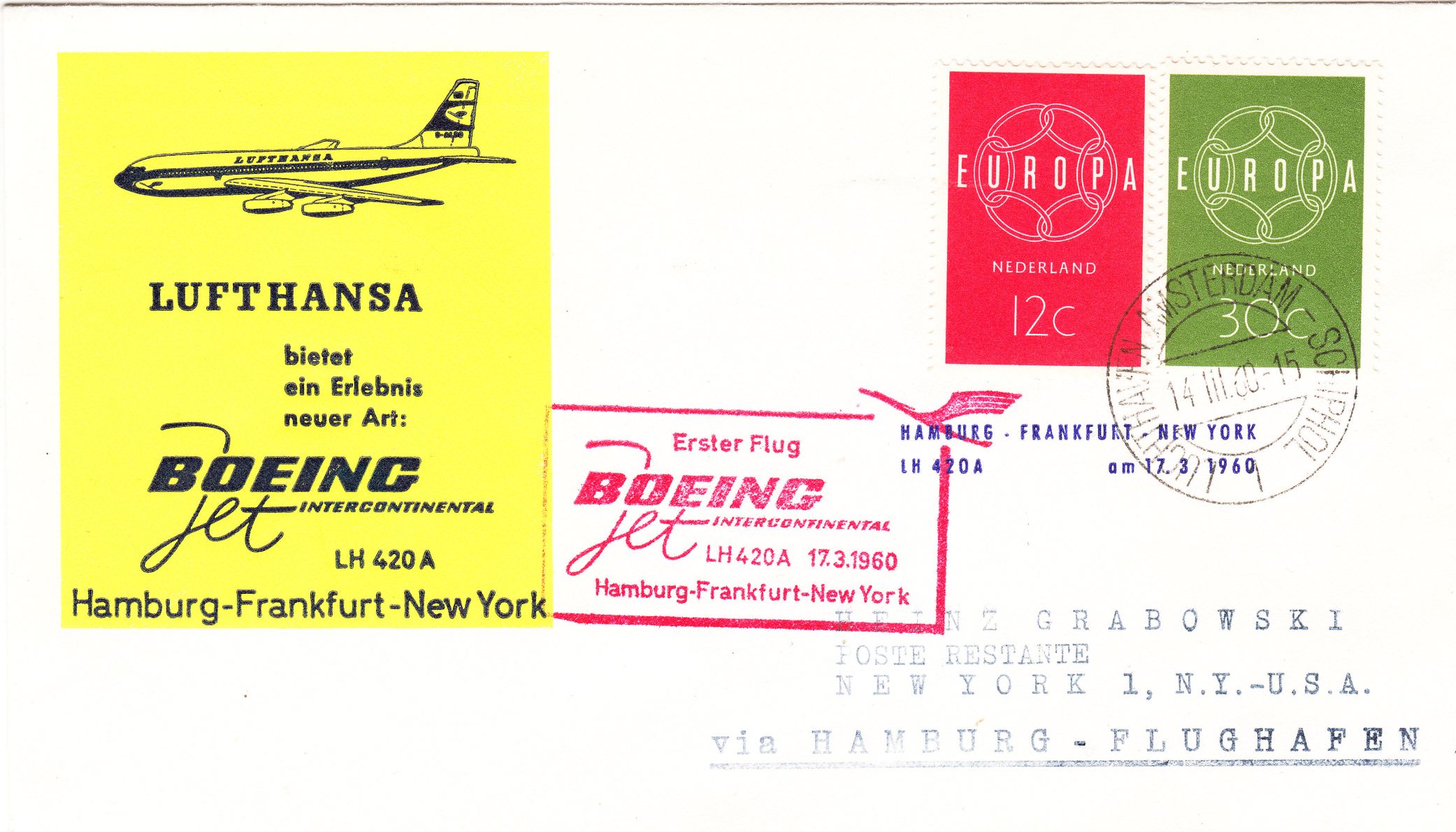 Satzbrief, frankiert mit Niederlande MiNr. 735/6, am 14.03.1960 am Flughafen Amsterdam Schipol aufgegeben als Zuleitungspost zum am 17.03.1960 durchgeführten Erstflug LH 420 A von Hamburg über Frankfurt nach New York, der per BOEING JET INTERCONTINENTAL durchgeführt wurde: