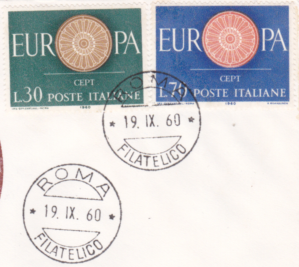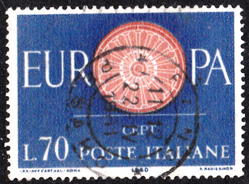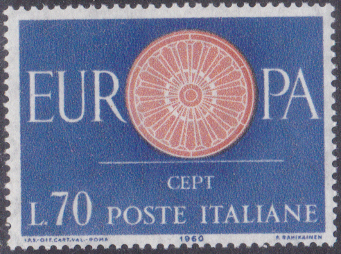 In Italien sind die Europamarken 1960 am 19. September 1960 mit dem Gemeinschaftsmotiv "„O“ in „EUROPA“ als Wagenrad mit 19 Speichen" erschienen. Hier der Wert zu 70 Lire ultramarin/rotorange, der in einer Auflage von 15 000 000 Stück erschien.