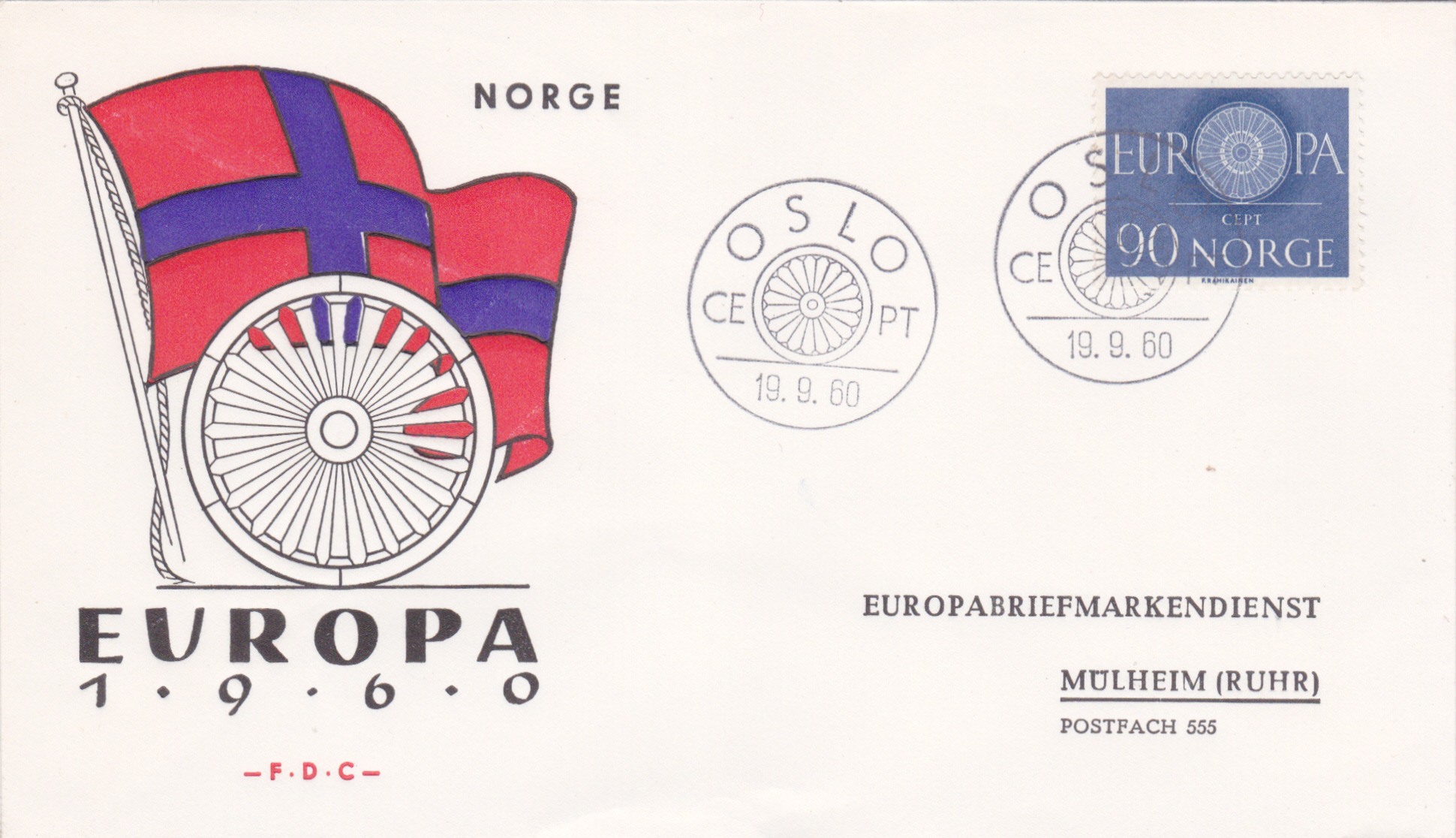 In Norwegen erschien eine Europamarke 1960 am 19.9.1960. Hier die Marke zu 90 Öre Preußischblau mit dem Gemeinschaftsmotiv "O" in "EUROPA" als Wagenrad mit 19 Speichen. Die Auflage betrug 2 175 500 Stück.