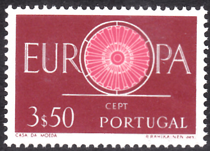 In Portugal sind die Europamarken 1960 am 16. September 1960 mit dem Gemeinschaftsmotiv "„O“ in „EUROPA“ als Wagenrad mit 19 Speichen" erschienen. Hier der Wert zu 3,50 Escudo braunkarmin/karmin, der in einer Auflage von 1 000 000 Stück erschien.
