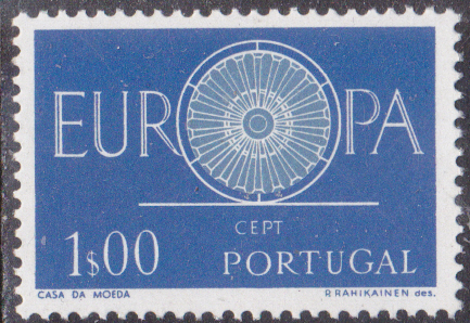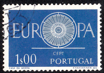 In Portugal sind die Europamarken 1960 am 16. September 1960 mit dem Gemeinschaftsmotiv "„O“ in „EUROPA“ als Wagenrad mit 19 Speichen" erschienen. Hier der Wert zu 1,00 Escudo kornblumenblau/hellkobalt, der in einer Auflage von 9 000 000 Stück erschien.
