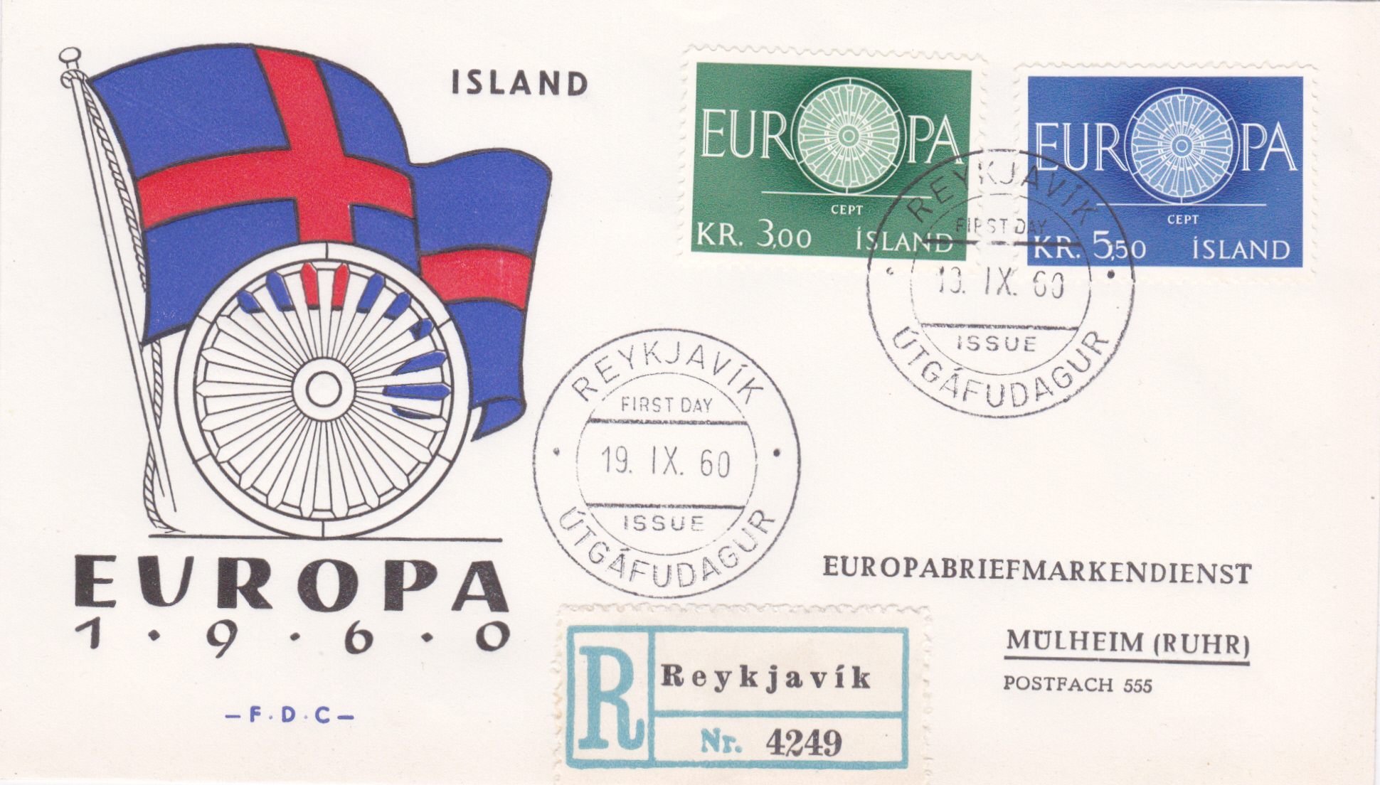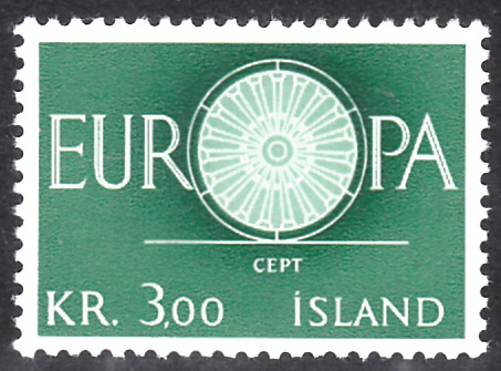 In Island erschienen die Europamarken 1960 am 19.9.1960. Hier die Marke zu 3,00 Kr smaragdgrün/hellbläulichgrün mit dem Gemeinschaftsmotiv "O" in "EUROPA" als Wagenrad mit 19 Speichen. Die Auflage betrug 1 500 000 Stück.