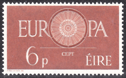 In Irland erschienen die Europamarken 1960 am 19.9.1960. Hier die Marke zu 6 Pence orangebraun mit dem Gemeinschaftsmotiv "O" in "EUROPA" als Wagenrad mit 19 Speichen. Die Auflage betrug 1 601 040 Stück.
