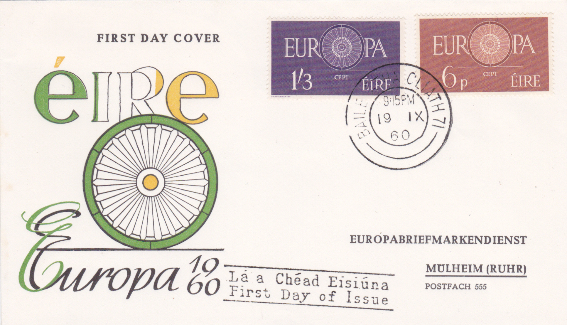 In Irland erschienen die Europamarken 1960 am 19.9.1960. Hier die Marke zu 1 Shilling 3 Pence blauviolett mit dem Gemeinschaftsmotiv "O" in "EUROPA" als Wagenrad mit 19 Speichen. Die Auflage betrug 1 170 240 Stück.