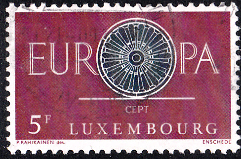 In Luxemburg erschienen die Europamarken 1960 am 19. September 1960. Hier die Marke zu 5 Fr braunkarmin/grünlichschwarz mit dem Gemeinschaftsmotiv "„O“ in „EUROPA“ als Wagenrad mit 19 Speichen", die in einer Auflage von 1 052 100 Stück erschienen ist.