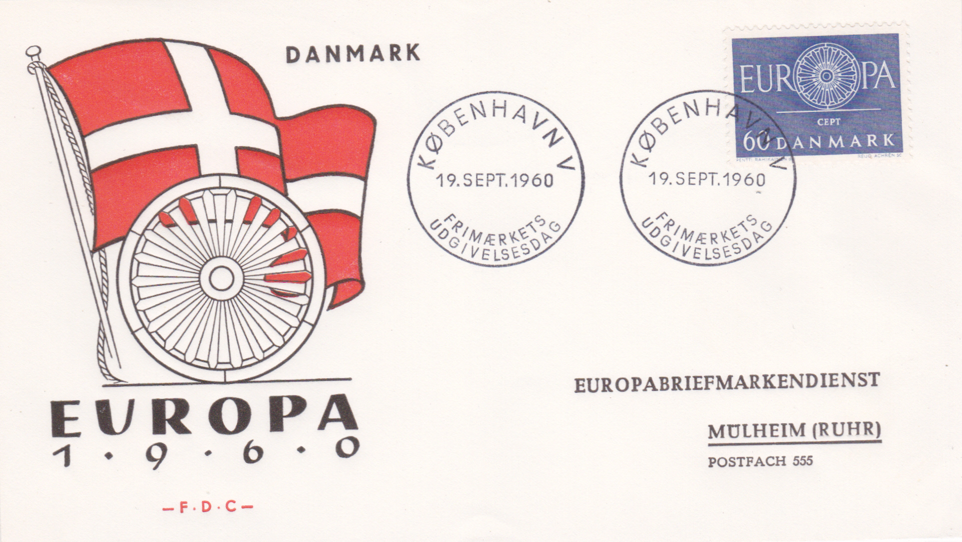 1960 erschienen die Europamarken erstmals als offizielle "Europa CEPT Ausgabe". Aus diesem Anlaß gaben 20 Länder insgesamt 36 Postwertzeichen heraus, mehr als doppelt soviele wie 1959! Gleich 11 Länder hatten 1960 ihre Premiere bezüglich der Ausgabe von Europamarken: Dänemark, Finnland, Großbritannien, Griechenland, Island, Irland, Liechtenstein, Norwegen, Portugal, Spanien und Schweden. Das gemeinsame Motiv war ein Speichenrad eines römischen Postwagens mit 19 Speichen, das von dem finnischen Künstler Pentti Rahikainen gestaltet wurde.