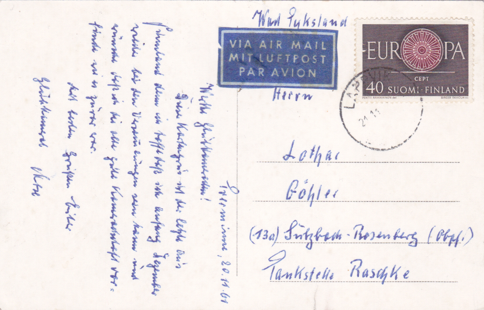Postkarte mit Luftpost vom Lappvig nach Sulzbach-Rosenberg mit einer Europamarke 1960 zu 40 M.