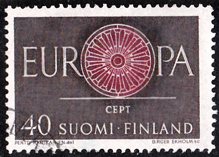 In Finnland sind die Europamarken 1960 am 19. September 1960 mit dem Gemeinschaftsmotiv " „O“ in „EUROPA“ als Wagenrad mit 19 Speichen" erschienen. Hier der Wert zu 40 M lilaschwarz/dunkelkarminbraun, der in einer Auflage von 2 996 901 Stück erschien.