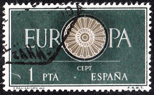 In Spanien sind die Europamarken 1960 am 19. September 1960 mit dem Gemeinschaftsmotiv "„O“ in „EUROPA“ als Wagenrad mit 19 Speichen" erschienen. Hier der Wert zu 1 Pta schwarzgrün/braunoliv, der in einer Auflage von 5 500 000 Stück erschien.