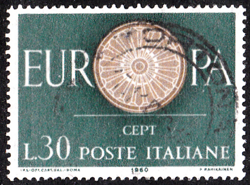 In Italien sind die Europamarken 1960 am 19. September 1960 mit dem Gemeinschaftsmotiv "„O“ in „EUROPA“ als Wagenrad mit 19 Speichen" erschienen. Hier der Wert zu 30 Lire schwarzblaugrün/ockerbraun, der in einer Auflage von 50 000 000 Stück erschien.