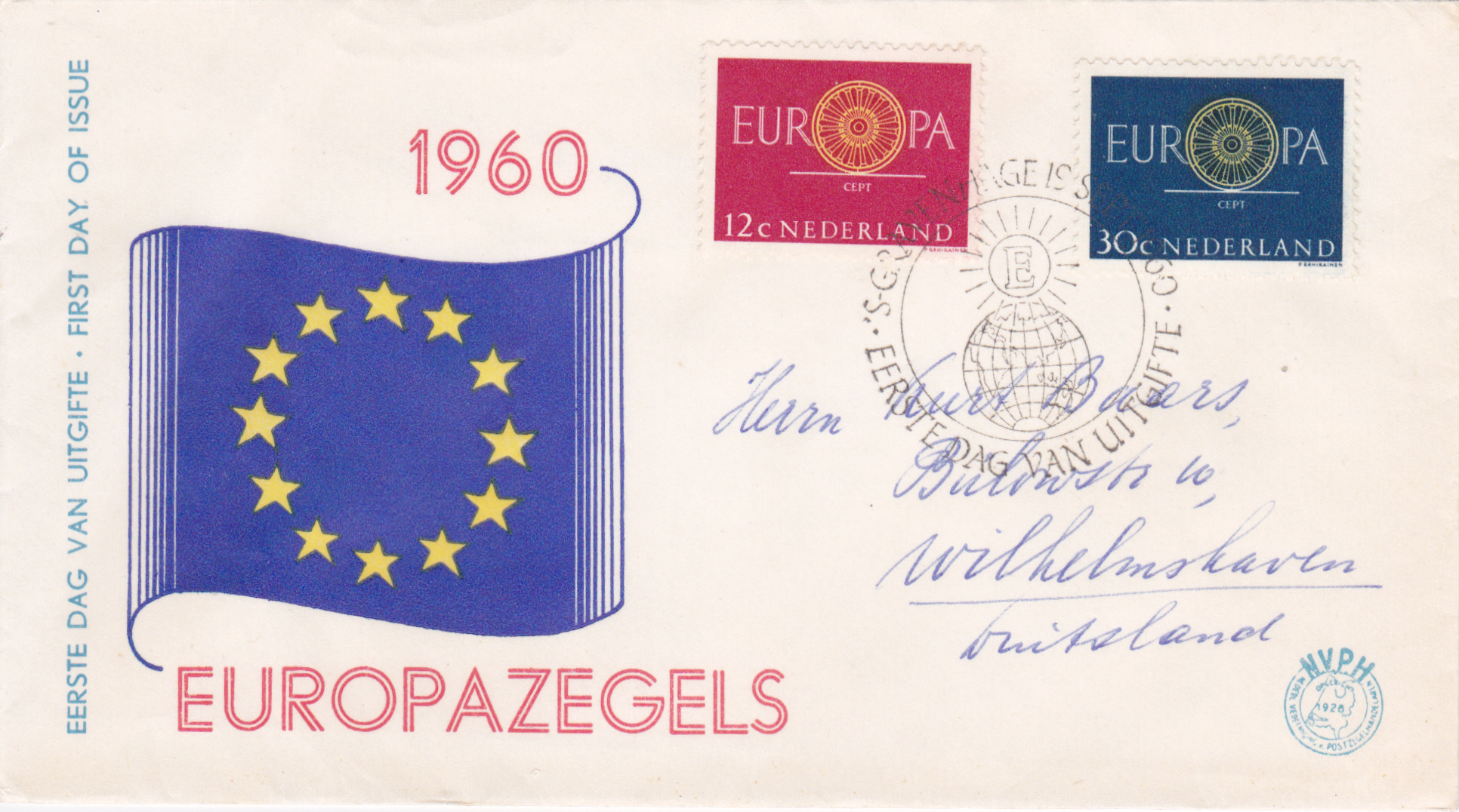 In den Niederlande sind die Europamarken 1960 am 19. September 1960 mit dem Gemeinschaftsmotiv "„O“ in „EUROPA“ als Wagenrad mit 19 Speichen" erschienen. Hier der Wert zu 30 Cent preußischblau/gelb, der in einer Auflage von 2 746 500 Stück erschien.
