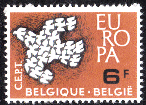 In Belgien erschienen die Europamarken 1961 am 16. September 1961. Hier die Marke zu 6 Francs hellorangebraun/schwarz mit dem Gemeinschaftsmotiv "Stilisierte Taube aus 19 Einzeltauben", die in einer Auflage von 3 552 851 Stück erschienen ist.