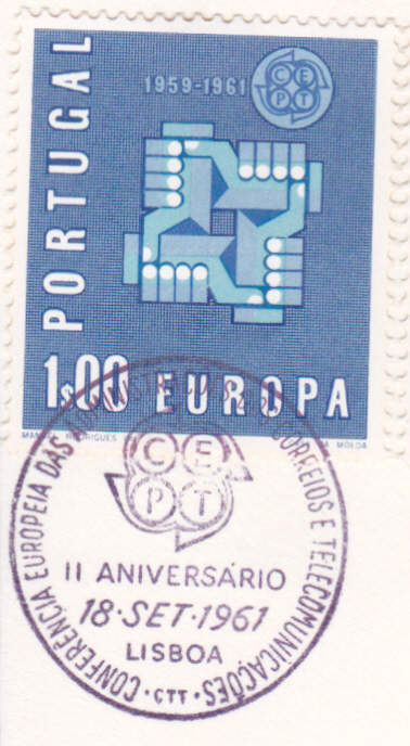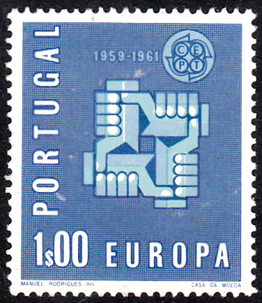 In Portugal erschienen die Europamarken 1961 am 18. September 1961 nicht mit dem Gemeinschaftsmotiv "Stilisierte Taube aus 19 Einzeltauben", sondern mit dem Motiv "Stilisierte verschlungene Hände" und CEPT-Symbol. Hier die Marke zu 1,00 Escudo, die in einer Auflage von 9 000 000 Stück erschienen ist.