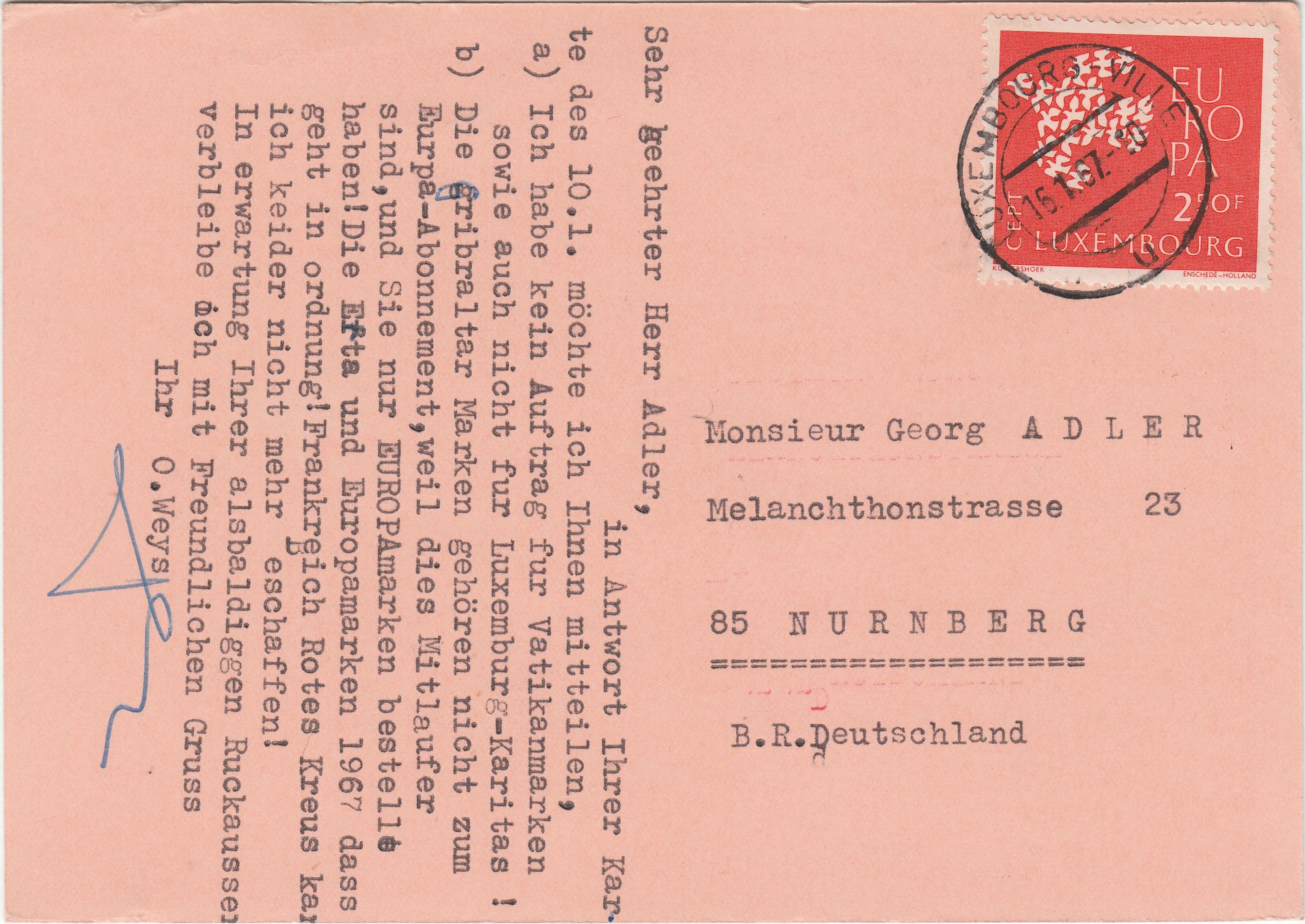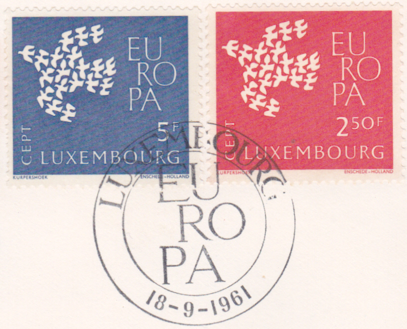 Am 18.09.1961 erschien in Luxemburg diese Europamarke der Wertstufe 2,50 Francs, die als Luxemburg MiNr. 647 katalogisiert wurde, hier als EF auf einer Postkarte nach Deutschland: