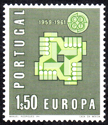 In Portugal erschienen die Europamarken 1961 am 18. September 1961 nicht mit dem Gemeinschaftsmotiv "Stilisierte Taube aus 19 Einzeltauben", sondern mit dem Motiv "Stilisierte verschlungene Hände" und CEPT-Symbol. Hier die Marke zu 1,50 Escudo, die in einer Auflage von 1 000 000 Stück erschienen ist.