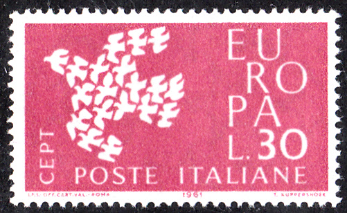 In Italien erschienen die Europamarken 1961 am 18. September 1961. Hier die Marke zu 30 Lire rotlila mit dem Gemeinschaftsmotiv "Stilisierte Taube aus 19 Einzeltauben", die in einer Auflage von 49 882 000 Stück erschienen ist.