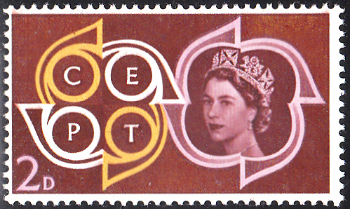 In Großbritannien erschienen die Europamarken 1961 am 18. September 1961. Hier die Marke zu 2 Pence mit dem CEPT-Emblem und Königin Elizabeth II., die in einer Auflage von 47 530 920 Stück erschienen ist.