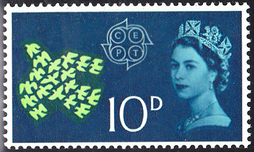 In Großbritannien erschienen die Europamarken 1961 am 18. September 1961. Hier die Marke zu 10 Pence mit dem Gemeinschaftsmotiv "Stilisierte Taube aus 19 Einzeltauben", dem CEPT-Emblem und Königin Elizabeth II., die in einer Auflage von 5 427 780 Stück erschienen ist.