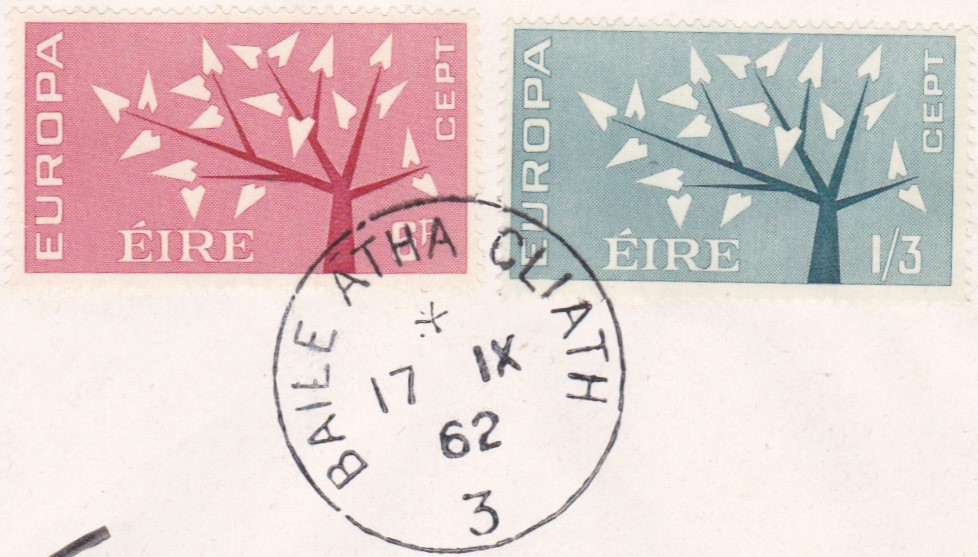 Briefstück mit den beiden Europamarken 1962 aus Irland mit einem Tagesstempel aus Baile Átha Cliath (irscher Name für Dublin) vom Ersttag.