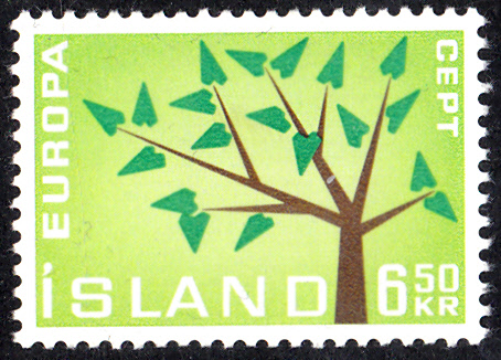 In Island erschienen die Europamarken 1962 am 17. Sept. 1962. Hier die Marke zu 6,50 Kronen mit dem Gemeinschaftsmotiv "Stilisierter Baum mit 19 Blättern ", die in einer Auflage von 2 000 000 Stück erschien.