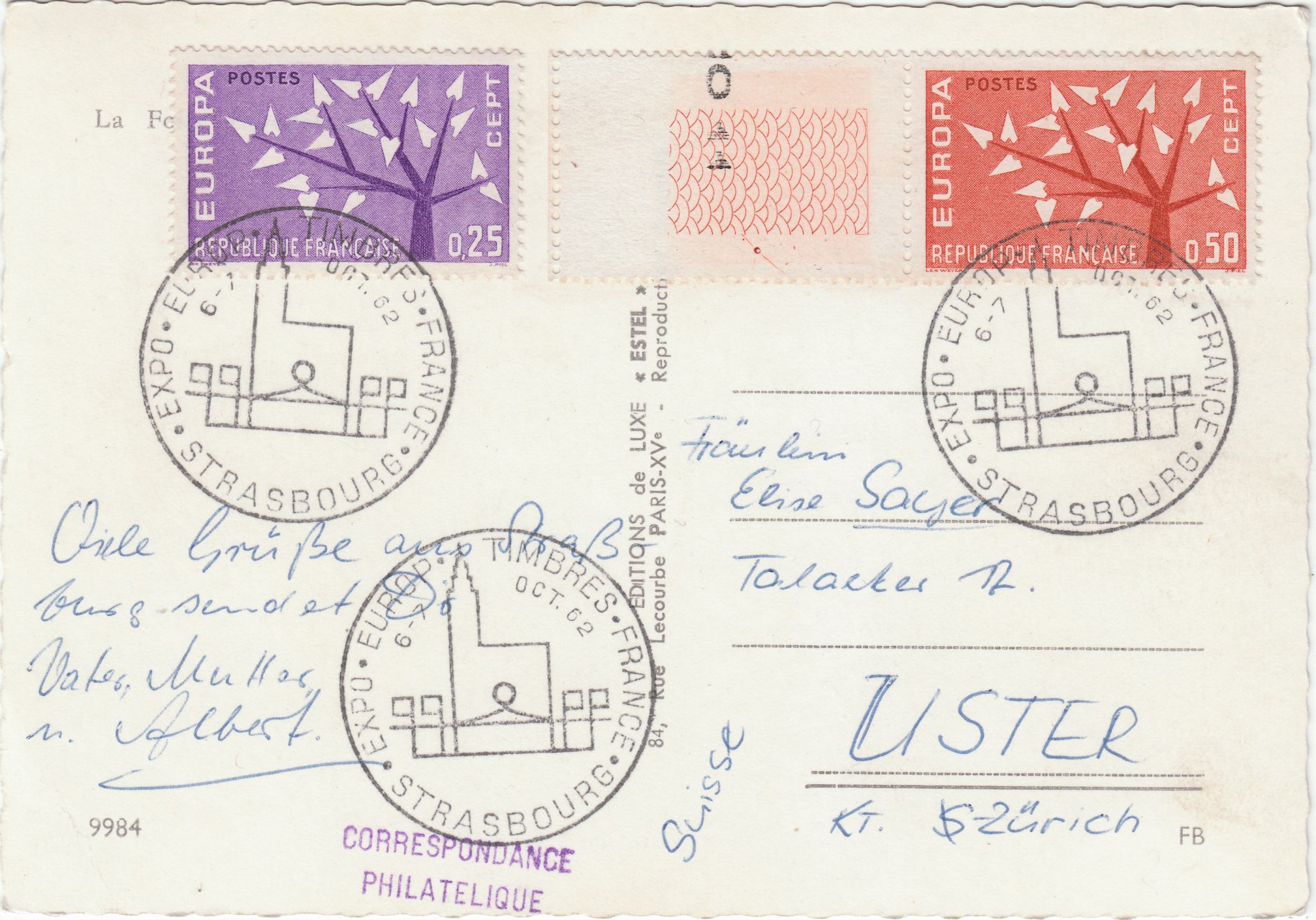 Hier eine Postkarte frankiert mit den beiden französischen Europamarken aus 1962, die MiNr. 1412 mit einer Allonge = einem bedruckten Leerfeld in Markengröße: