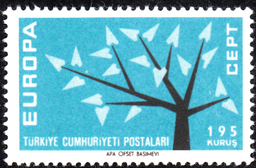 In der Türkei erschienen die Europamarken 1962 am 17. September 1962. Hier die Marke zu 195 Kurus hellblau/braunschwarz mit dem Gemeinschaftsmotiv "Stilisierter Baum mit 19 Blättern", die in einer Auflage von 1 400 000 Stück erschien.
