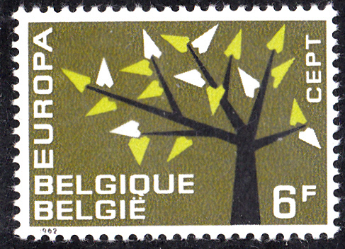 In Belgien erschienen die Europamarken 1962 am 15. September 1962. Hier die Marke zu 6 Francs mit dem Gemeinschaftsmotiv "Stilisierter Baum mit 19 Blättern", die in einer Auflage von 6 000 000 Stück erschien.