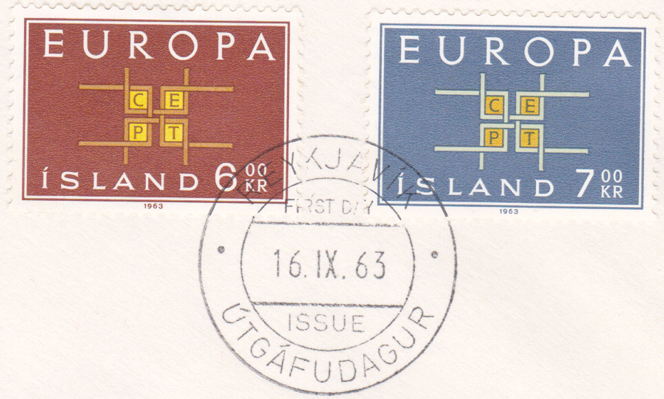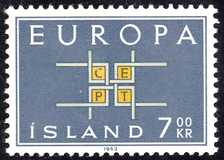 In Island erschienen die Europamarken 1963 am 16. Sept. 1963. Hier die Marke zu 6,00 Kronen mit dem Gemeinschaftsmotiv "Buchstaben „CEPT“ in Ornament", die in einer Auflage von 1 500 000 Stück erschien.